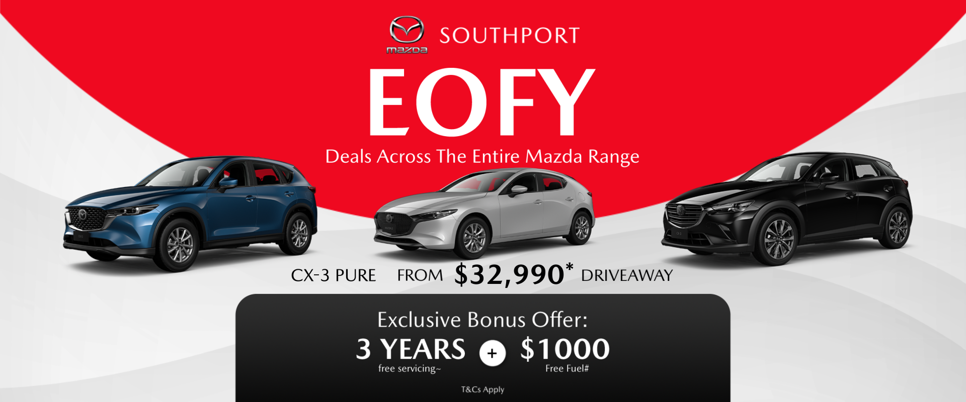 Offers apply to new in-stock Mazda vehicles purchased from Southport Mazda during the EOFY promotional period. While stocks last. Offers are not available in conjunction with any other offer unless specified.