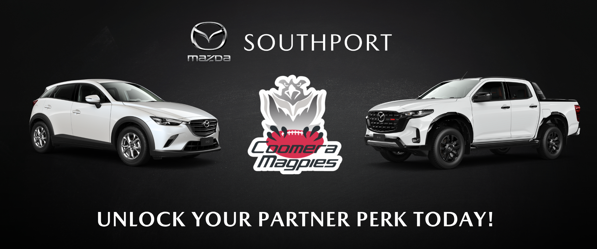 *Terms & conditions apply. Offer valid on all new Mazda vehicles purchased at Southport Mazda. Members must present a valid Coomera Magpies AFL Club membership at the point of entry into the showroom to qualify.